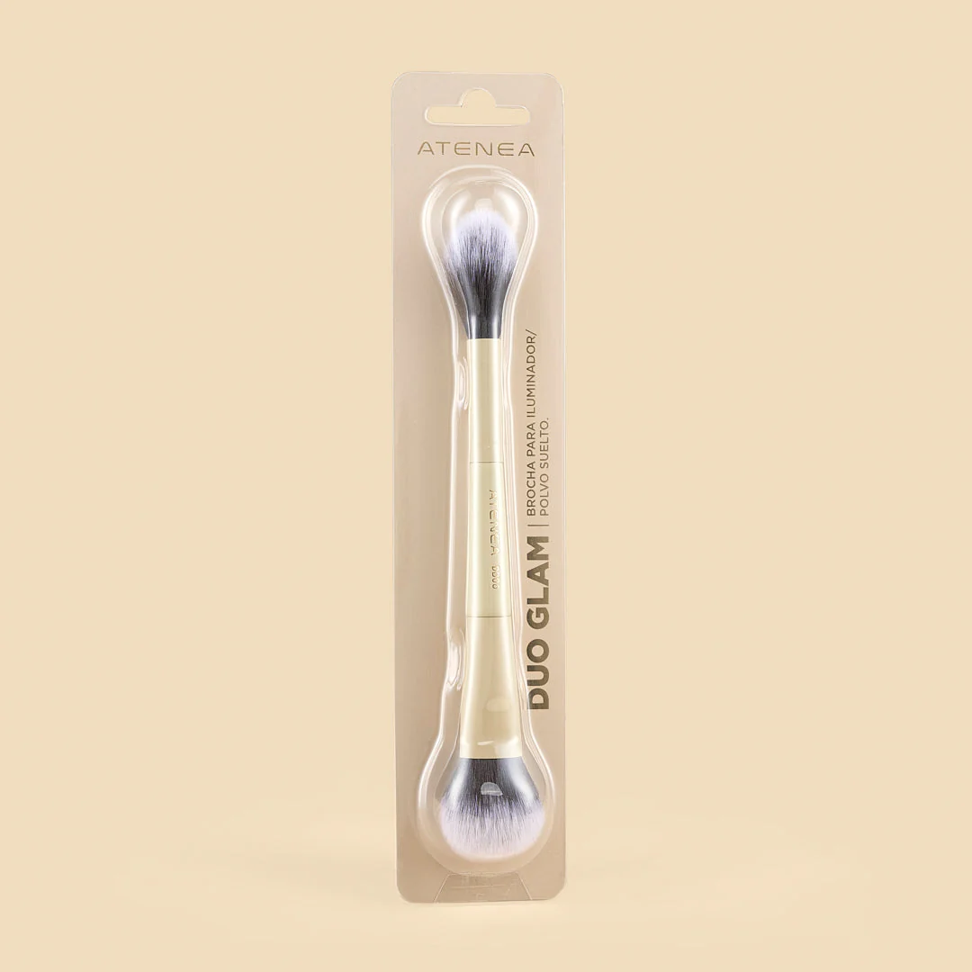 Brocha para iluminador Atenea y brocha para polvo suelto Atenea dual está pensada para brindar precisión y armonía en el maquillaje del rostro.